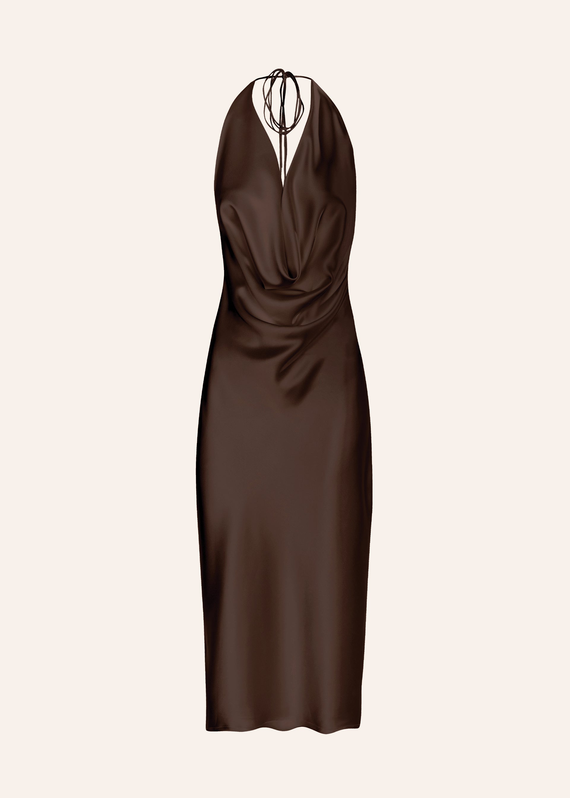 A satin dress featuring a plunging neckline, paired with delicate spaghetti straps adorned with metal tips, adjustable at the neck for a customizable neckline depth. The back is left beautifully bare, accentuated by meticulously crafted French seams for an elegant finish.