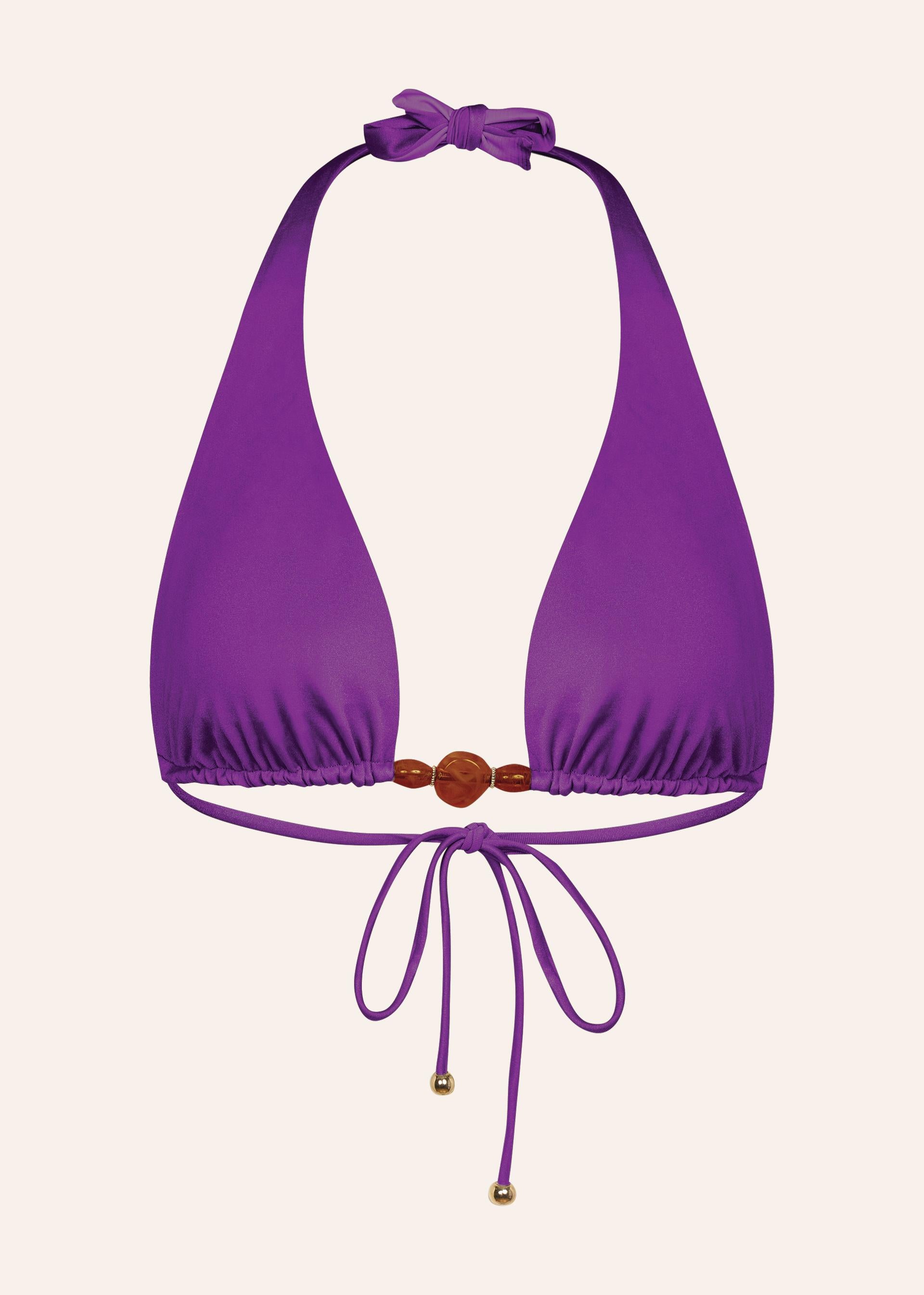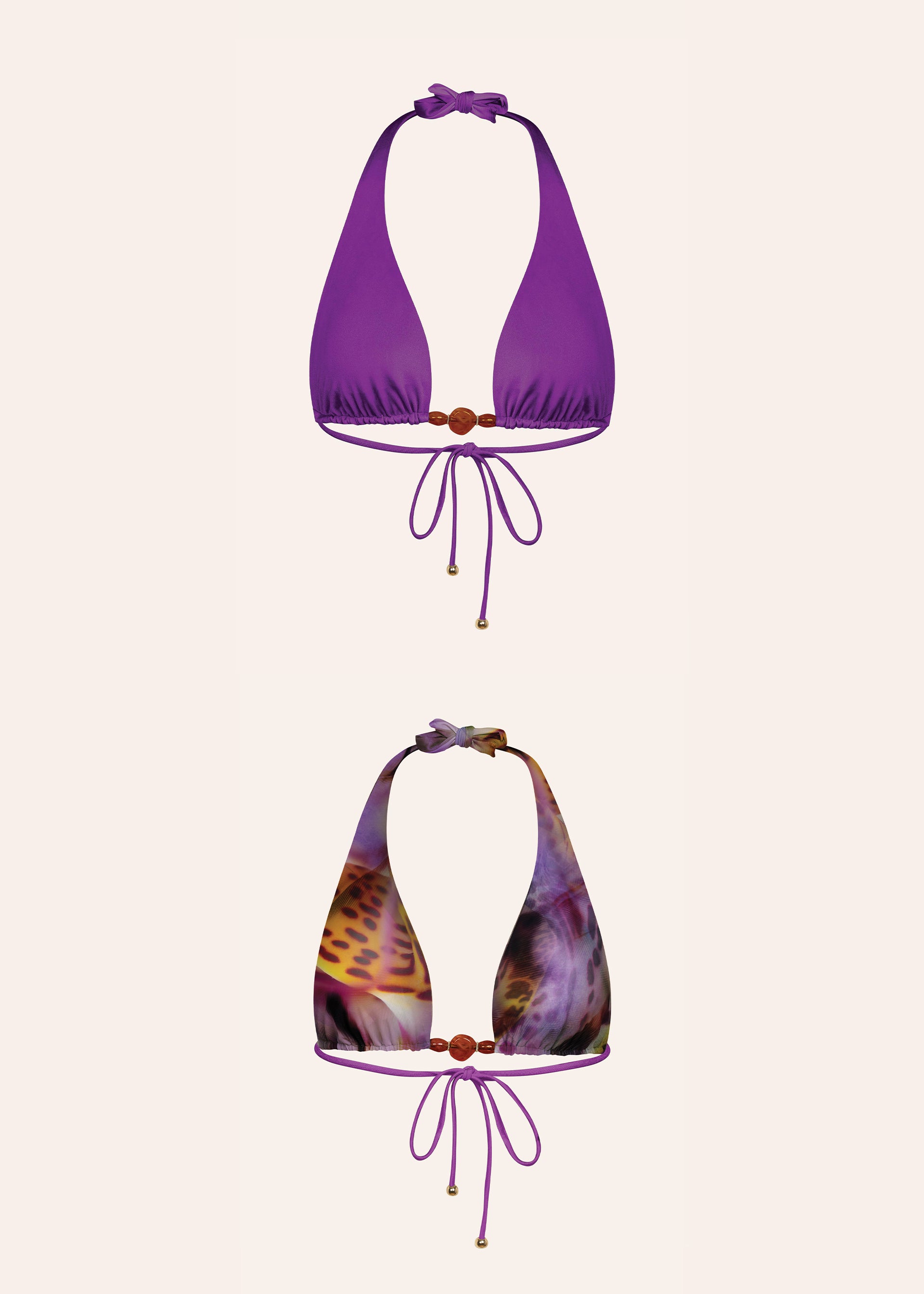 A classic reversible triangle style bikini top with adjustable ties at the neck and back, ensuring a perfect fit and comfort. The bikini is finished with delicate jewelry accents, adding a refined, luxurious finish.