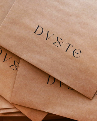 At DVETE, we are fully committed to eliminating plastic from our packaging. All our packaging materials, from labels and tissue paper to the cardboard envelopes, are made from recycled and biodegradable paper, ensuring that every step of the process is as sustainable as possible.